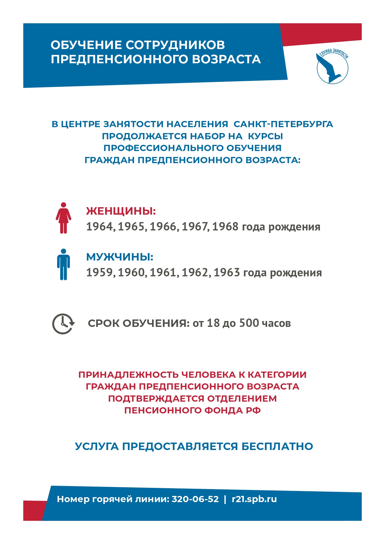 В рамках реализации регионального проекта «Разработка и реализация программы системной поддержки и повышения качества жизни граждан старшего поколения» и Плана мероприятий по реализации регионального проекта «Разработка и реализация программы системной поддержки и повышения качества жизни граждан старшего поколения» СПб ГАУ ЦЗН проводит обучение работников предпенсионного возраста, в целях развития их профессиональных навыков и компетенций.